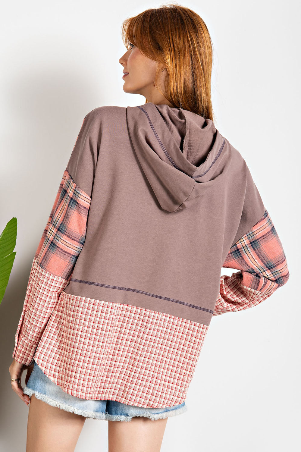 This hoodie is a stylish and versatile piece with a playful twist. It features a solid mauve body with soft drawstrings, while the sleeves and sides are made from contrasting plaid and checkered fabric. The mix of textures gives it a layered look, perfect for transitioning between seasons.